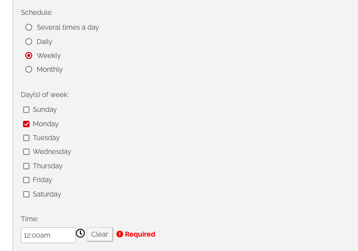 - Weekly – the task will run on certain days of the week, at a particular time: