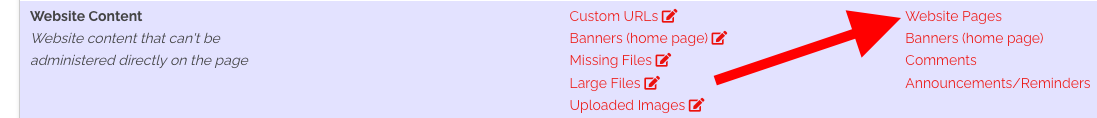 - Scroll down a little to the Website Content section, and click on "Website Pages" on the right-hand side.