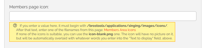 /brostools/applications/singing/images/icons/icon-blank.png - Or, if you want to use one of the icons where there's a little picture, click on the link which says "Members Area Icons". Make a note of the icon you want, such as "icon-special-events.png". Then, use the code above, but replace the last bit with this filename. For this example, it would be: