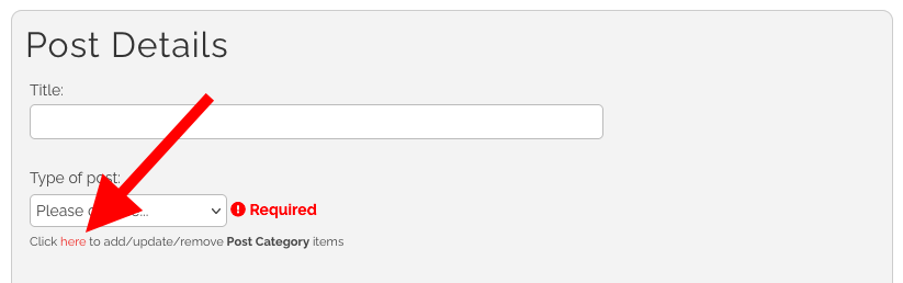 - Click the link where it says "Click here to add/update/remove Post Category items":